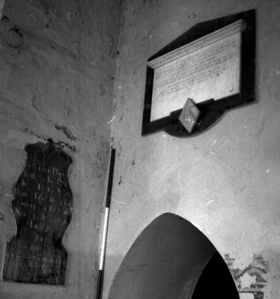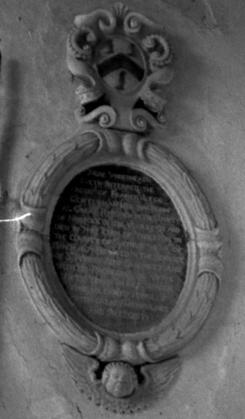 Chancel S.Wall Here lyeth interred the body of Francis Legg Gent. He was born at Gt Ryburgh in the County of Norfolk in the year 1591 and died in this Town of Ubbeston in the County of Suffolk on the 14th of March 1671. He lived in the service of Sir Robert Kemp Baronet and with his predeccessors above fifty years in all which time he carried himself with great faithfulness and integrity.
